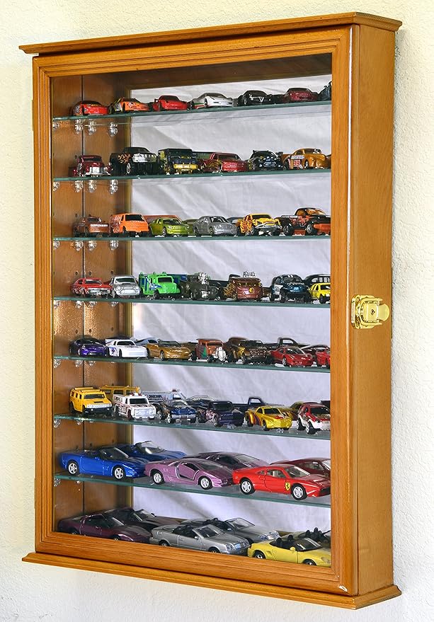 7 Adjustable Shelves Mirrored Hot Wheels/Matchbox/Diecast Cars / 1/64 1/43 Model Display Case Cabinet, Oak