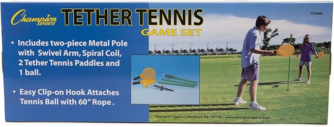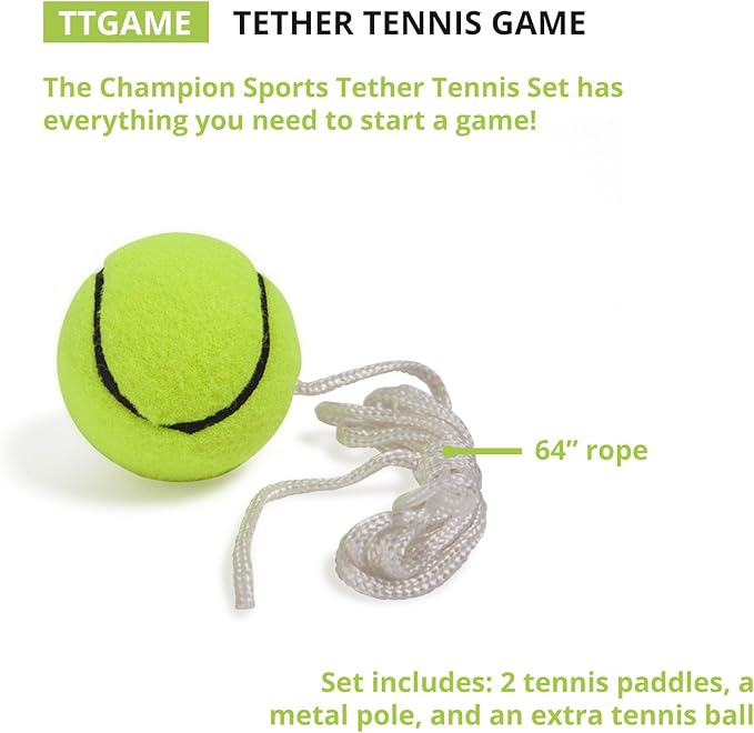 Champion Sports TTGAME Tetherball Tennis: Swingball Outdoor Lawn Game for Kids, Adults, and Families - Backyard Tether Kit with Tennis Ball and Paddle Set