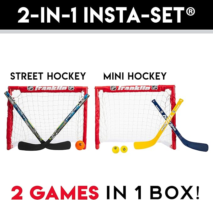 Franklin Sports - NHL Kids Folding Hockey Goals Set - (2) Street Hockey & Knee Hockey Goals - (2) Adjustable Youth Hockey Sticks, (2) Knee Hockey Sticks, (2) Mini Hockey Balls + (1) Street Hockey Ball