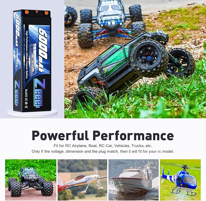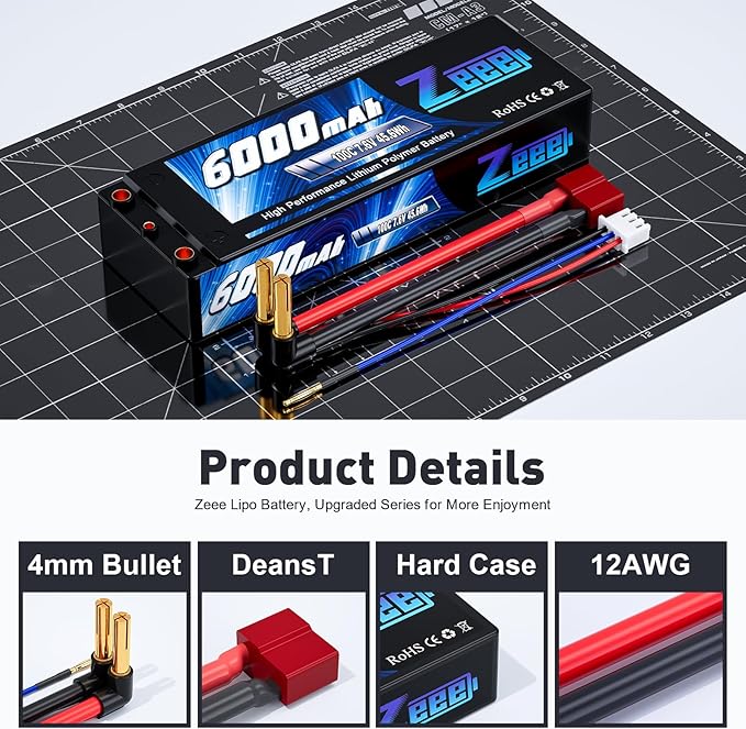 Zeee 2S High Voltage Lipo Battery 6000mAh 7.6V 100C Hard Case RC Battery with 4mm Bullet to T Connector for RC 1/8 1/10 Scale Vehicles Car RC Trucks Boats