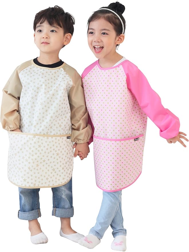 • Waterproof protection for messy play and painting. Keeps clothes clean during crafts, finger painting, or baking.