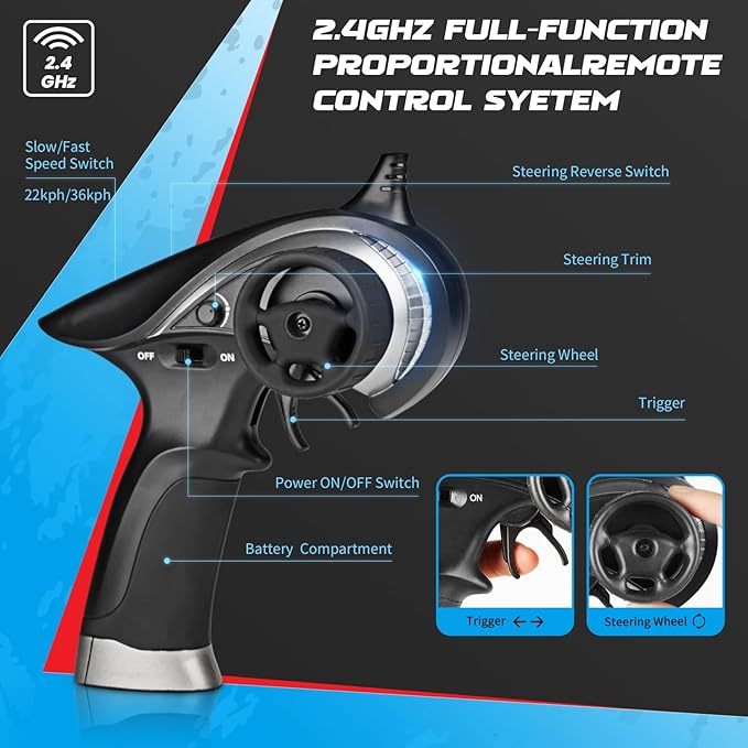 About This Powered by a high-performance brushed RC 380 motor with an efficient drivetrain, this 4WD RC truck reaches speeds... Read more