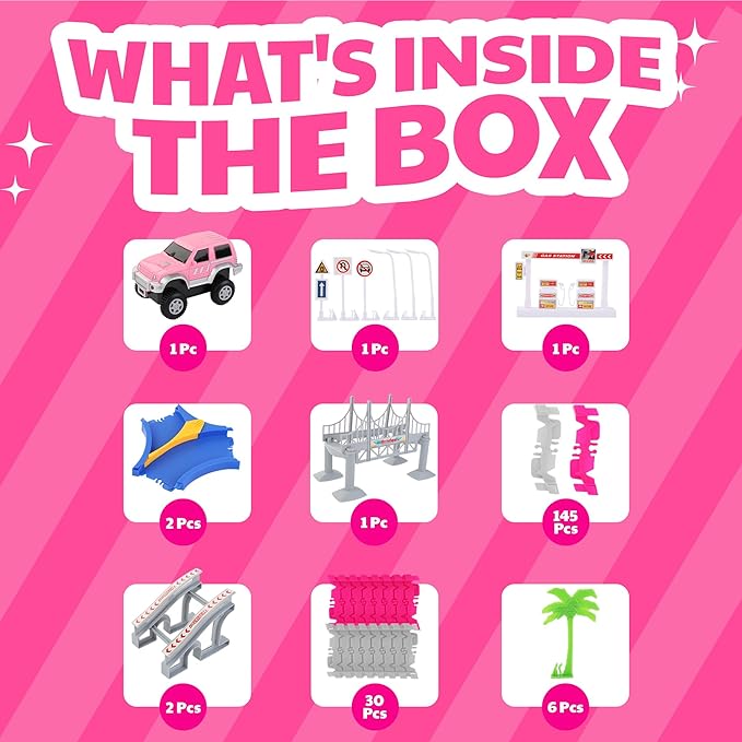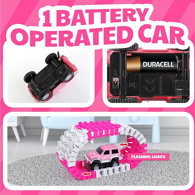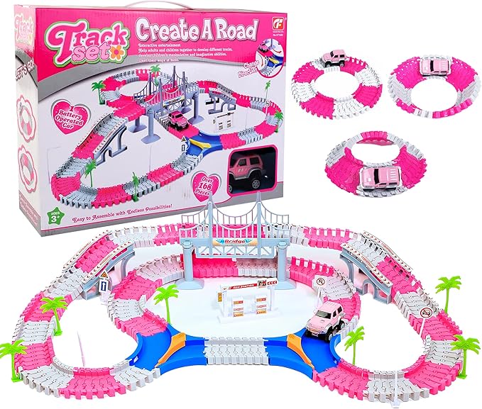 168 PCS Pink Magic Bendable Race Track Toy, Snap Together Create a Road Flexible Track Car Set for Toddlers, Kids, Boys, and Girls