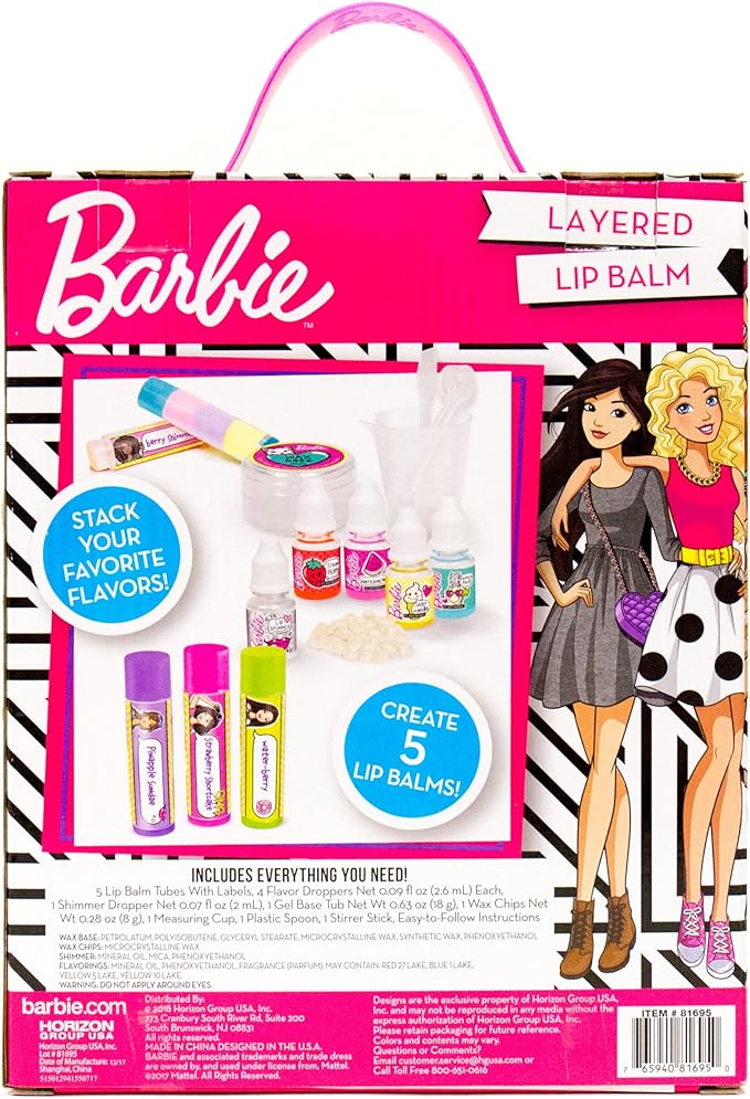 Horizon Group USA Barbie Make Your Own Layered Lip Balm Kit, DIY 5 Custom Lip balms by Mixing Flavors Like Vanilla, Strawberry, Watermelon & Tropical Punch, Multicolored