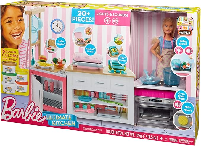 Barbie Kitchen Playset with Doll, Lights & Sounds, Food Molds, 5 Dough Colors and 20+ Accessories