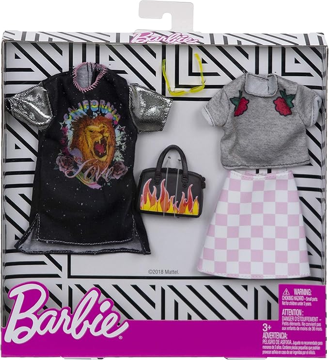 Barbie Clothes - 2 Outfits Doll Include a T-Shirt Dress with Retro Rock Graphic and Flame-Decorated Purse, Gift for 3 to 8 Year Olds