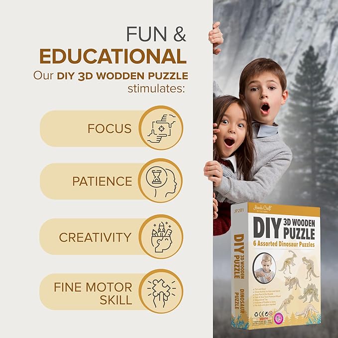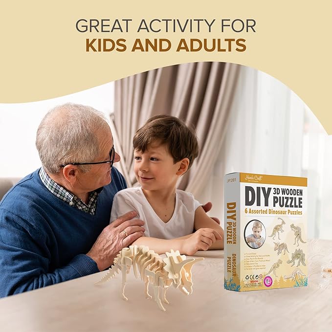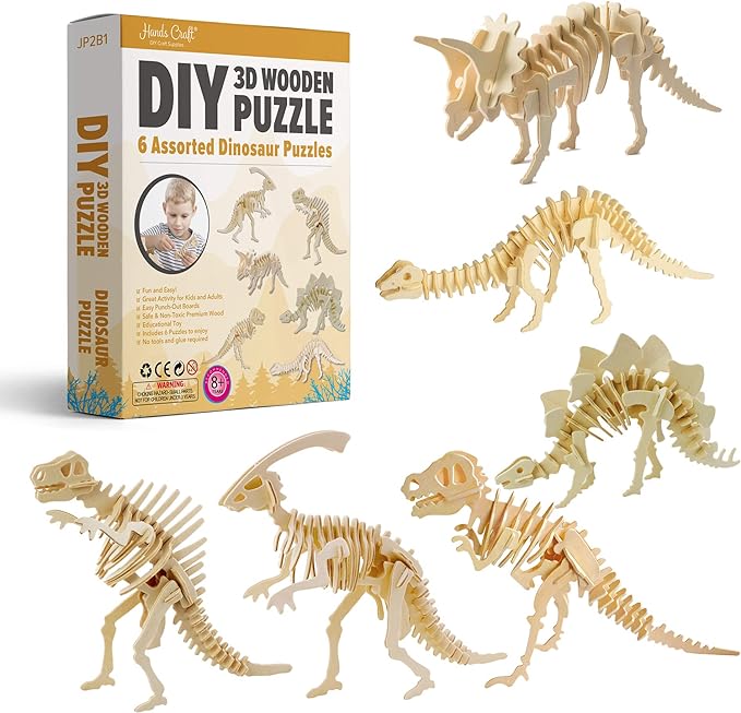 Hands Craft DIY 3D Wooden Puzzle – 6 Assorted Dinosaur Bundle Pack Set Brain Teaser Puzzles Educational STEM Toy Adults and Kids to Build Safe and Non-Toxic Easy Punch Out Premium Wood JP2B1