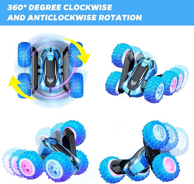 KKONES Remote Control Car, 2.4GHz Double Sided 360° Flips Rotating Electric Race RC Stunt Car, LED Wheel & Headlight High Speed Off Road Cars Toy Gift for 3 4 5 6 7 8-12 Year Old Boy Toys (Blue)