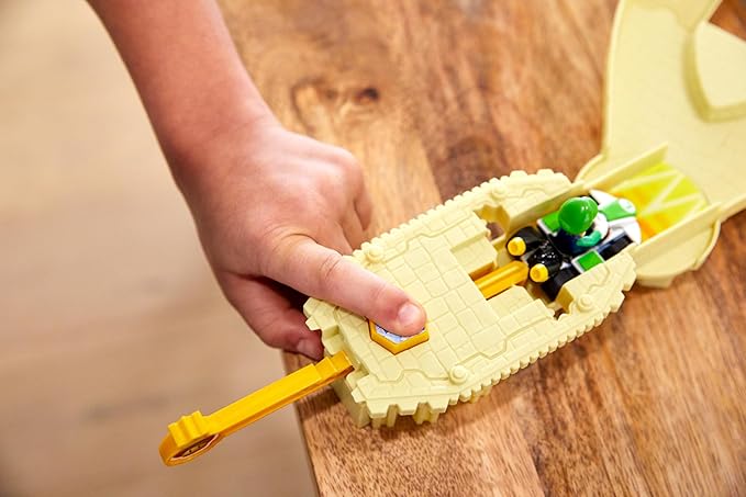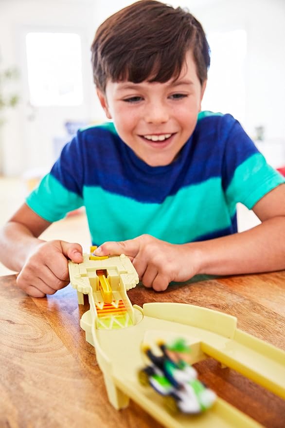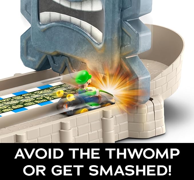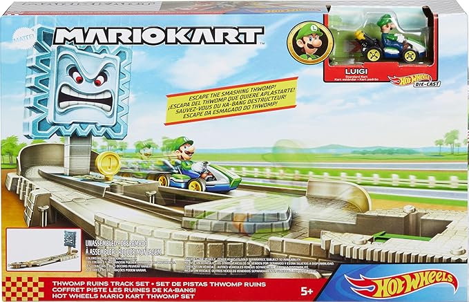 Hot Wheels Mario Kart Track Set & Toy Car, Thowmp Ruins Playset with Luigi Kart Vehicle & Pull-Back Launcher