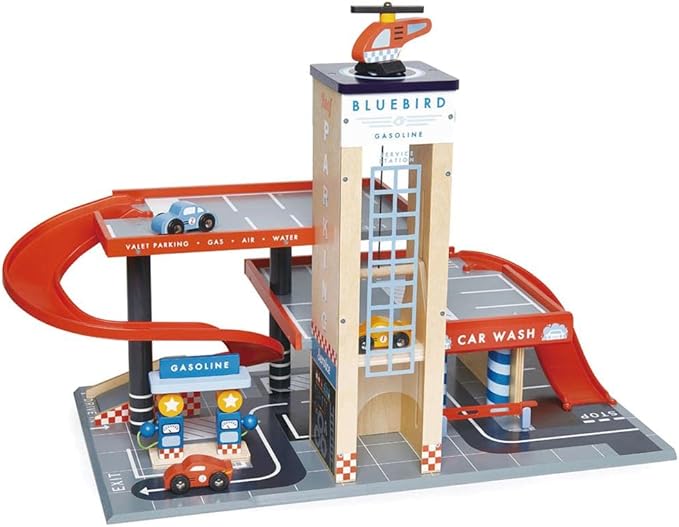 Tender Leaf Toys - Blue Bird Service Station - Classic Wooden Garage and Service Station for Cars and Helicopter with Ramps, Petrol Pumps and Car Wash Center - Imaginary and Roleplay for Children 3+