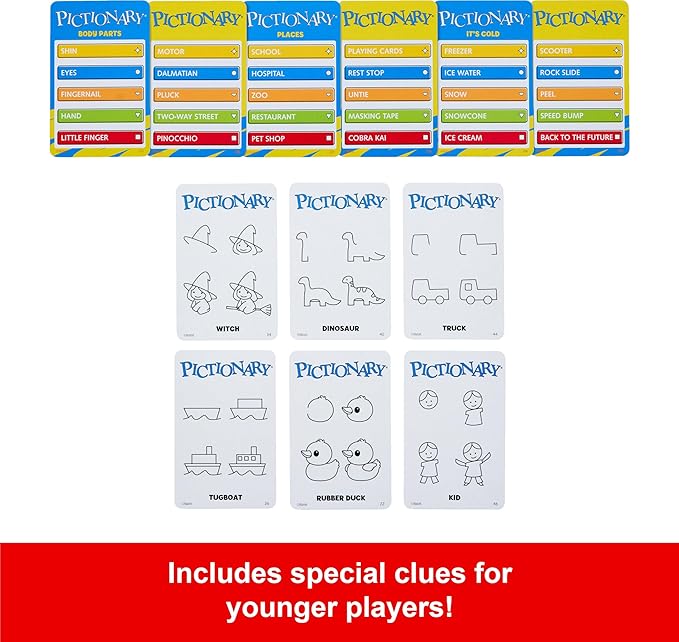 Mattel Games Pictionary Family Board Game for Kids, Adults and Game Night for 2 Teams with Erasable Markers, Boards and Sand Timer