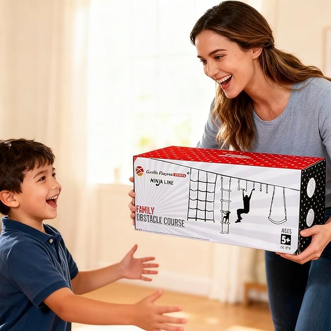 Ninja Warrior Obstacle Course for Kids,2×56ft Slackline Kit with 8 Ninja Accessories+Fast-Setup Buckles- Monkey Bar,Rope Ladder,Gymnastic Ring,Arm Trainer and Monkey Fist,Supports 880 lbs