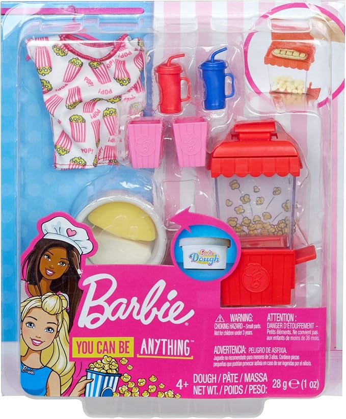 Barbie Cooking & Baking Accessory Pack with Popcorn-Themed Pieces, Including T-Shirt for Doll, Popcorn Machine Mold & Container of Molded Dough, Ages 4 Years Old & Up, Multi