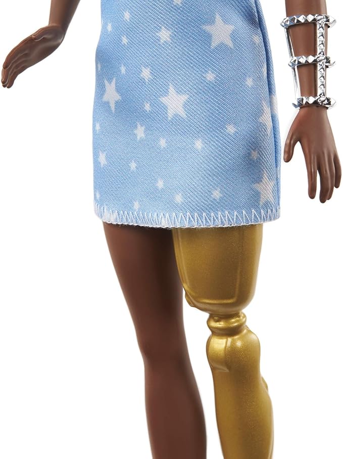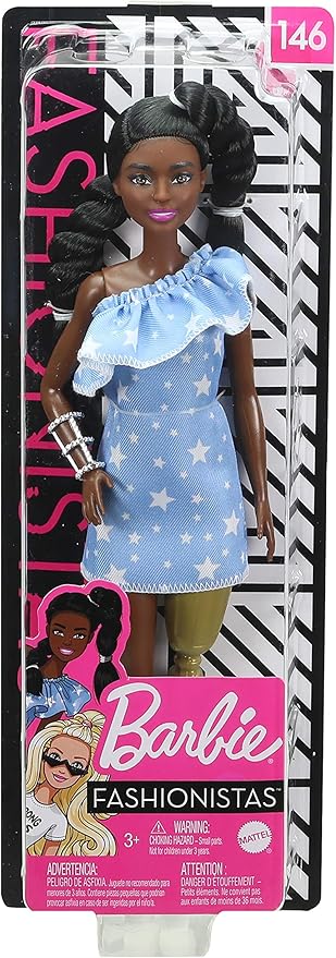 Barbie Fashionistas Doll #146 with 2 Twisted Braids & Prosthetic Leg Wearing Star-Print Dress, White Shoes & Arm Bracelet, Toy for Kids 3 to 8 Years Old