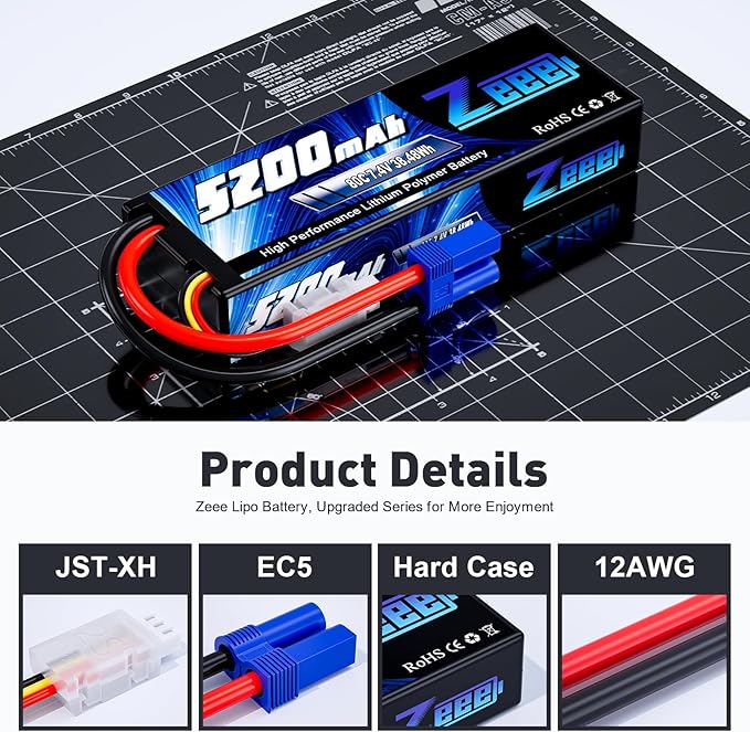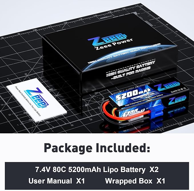 About This 【2S Lipo Specification】- Battery voltage: 7.4V; Configuration: 2S1P; Cell voltage: 3.2~4.2V; Capacity: 5200mAh; Discharge: 80C; Plug: EC5 Connector.... Read more