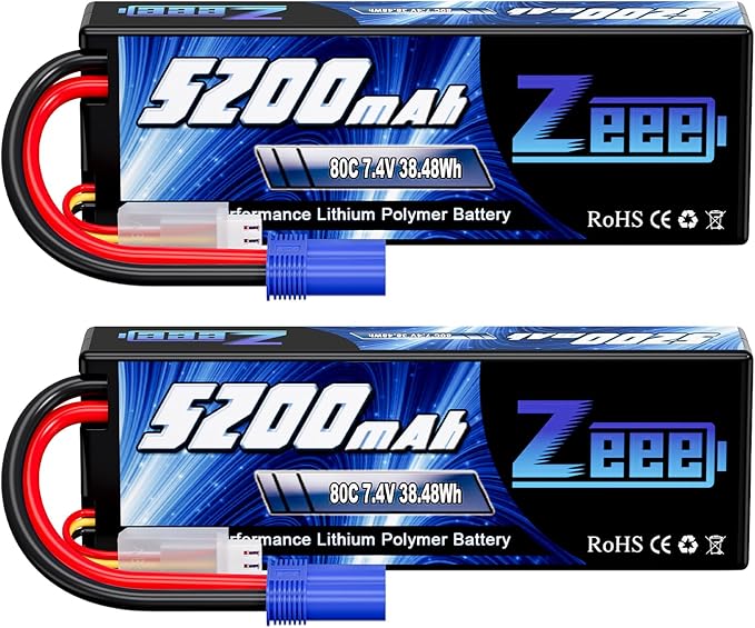 Zeee 2S Lipo Battery 7.4V 5200mAh 80C Hard Case Battery with EC5 Plug Compatible with 1/8 1/10 RC Vehicles Car Slash RC Buggy Truggy RC Airplane Drone(2 Pack)
