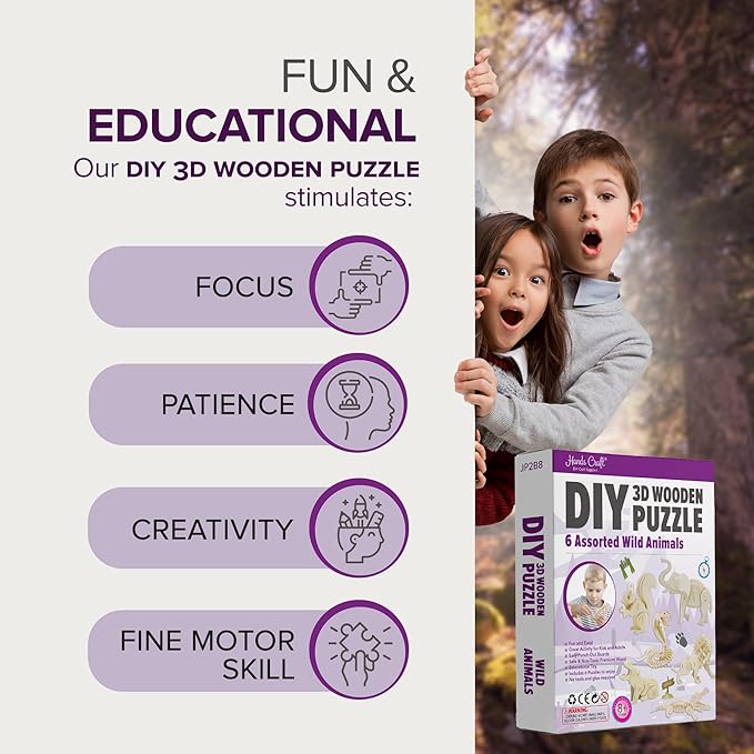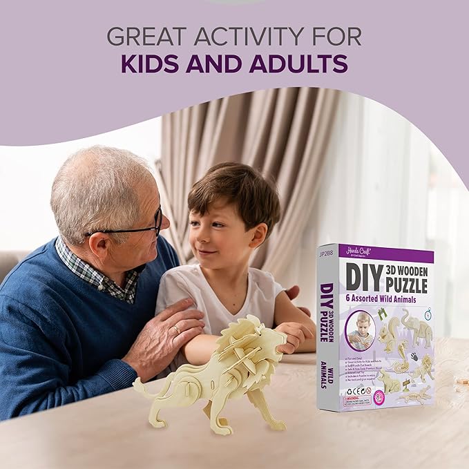 Hands Craft DIY 3D Wooden Puzzle – 6 Assorted Wild Animals Bundle Pack Set Brain Teaser Puzzles Educational STEM Toy Adults and Kids to Build Safe and Non-Toxic Easy Punch Out Premium Wood JP2B8