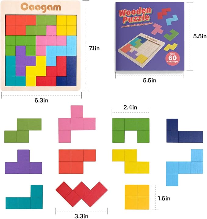 Coogam Wooden Puzzle Pattern Blocks Brain Teasers Game with 60 Challenges, 3D Russian Building Toy Wood Tangram Shape Jigsaw Puzzles Montessori STEM Educational Toys Gift for Kids Adults