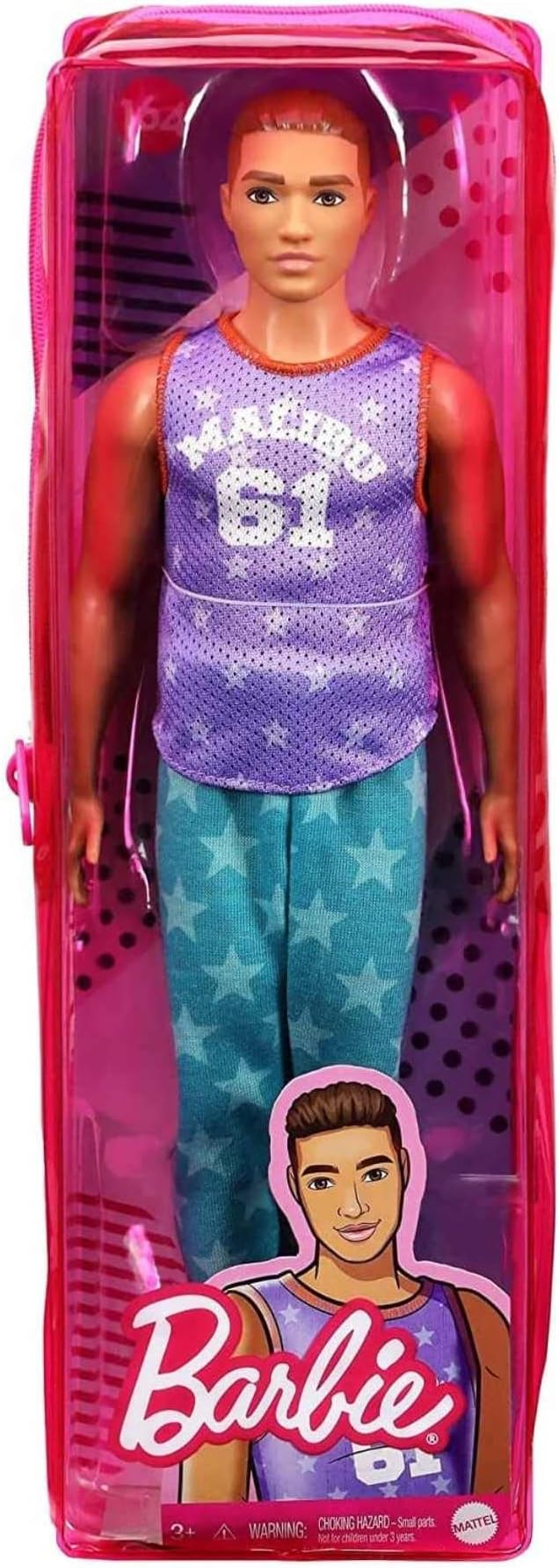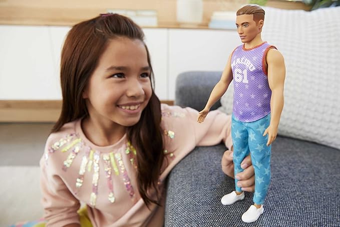 Barbie Ken Fashionistas Doll #165 with Sculpted Brown Hair Wearing Purple “Malibu” Top, Blue Starred Joggers & White Shoes, Toy for Kids 3 to 8 Years Old