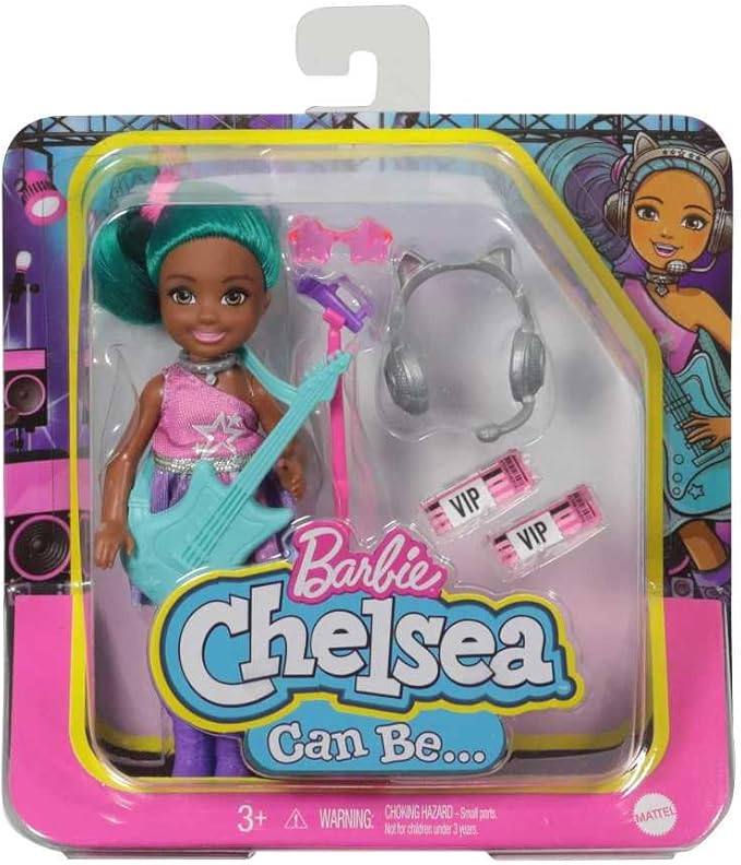 Barbie Chelsea Can Be Playset with Brunette Chelsea Rockstar Doll (6-in), Guitar, Microphone, Headphones, 2 VIP Tickets, Star-Shaped Glasses, Great Gift for Ages 3 Years Old & Up