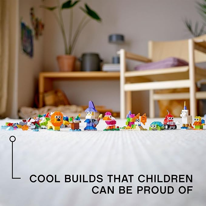 LEGO Classic Creative Transparent Bricks Building Set 11013 for Girls and Boys, STEM Toy and Preschool Hands-On Learning Toy, Includes Wizard, Unicorn, Lion, Bird, and Turtle