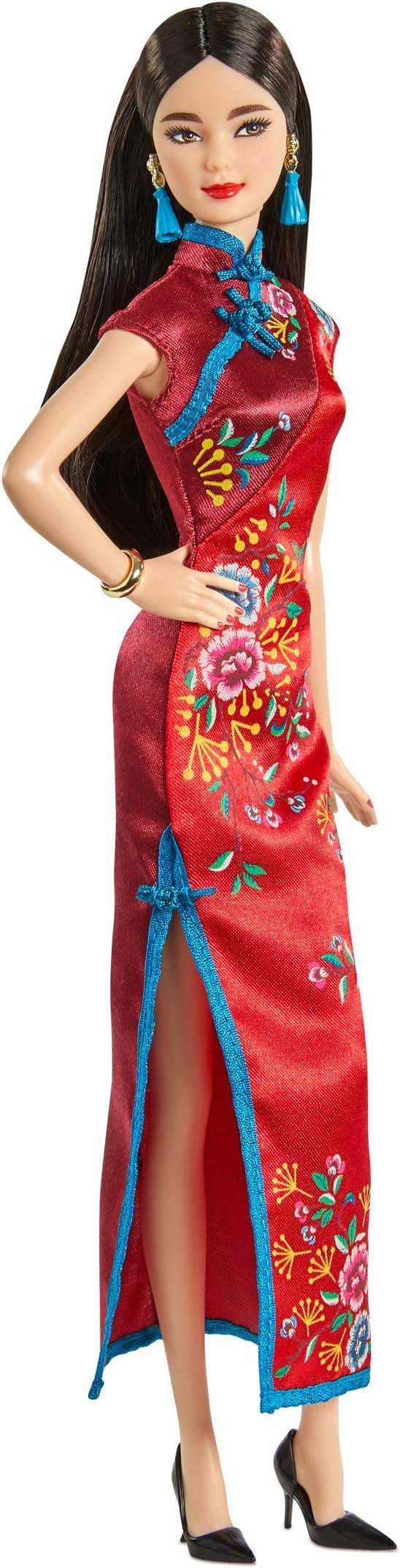 Barbie Signature Lunar New Year Doll (12-inch Brunette) Wearing Red Satin Cheongsam Dress with Accessories, Collectible Gift for Kids & Collectors