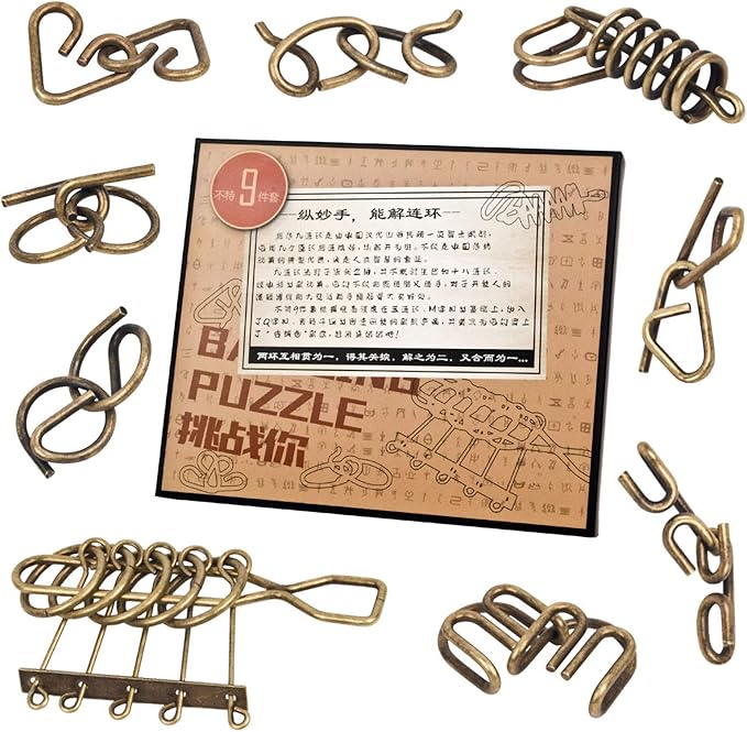 Assorted Ancient Metals Puzzle Brone Color Stress Relief Toys 9 Pack IQ Wire Puzzles with Paper Box Gift Package Great Educational Metals Still Puzzle Games Toys for Children and Adults by AHYUAN
