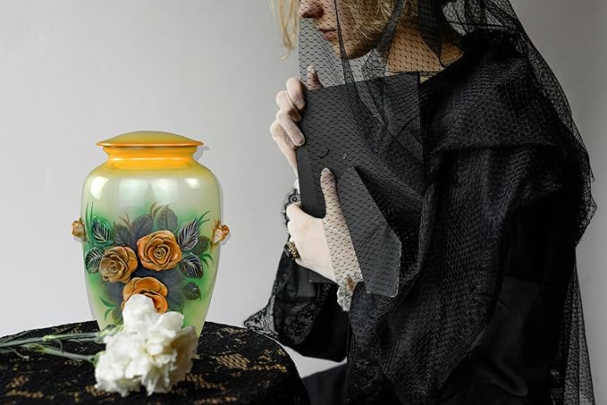 11" 3D Carved Decorative Flowers Aluminum Metal Cremation Urns for Human Ashes | Hand-Crafted Large Urn for Adult Cremation (Yellow Roses)
