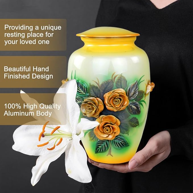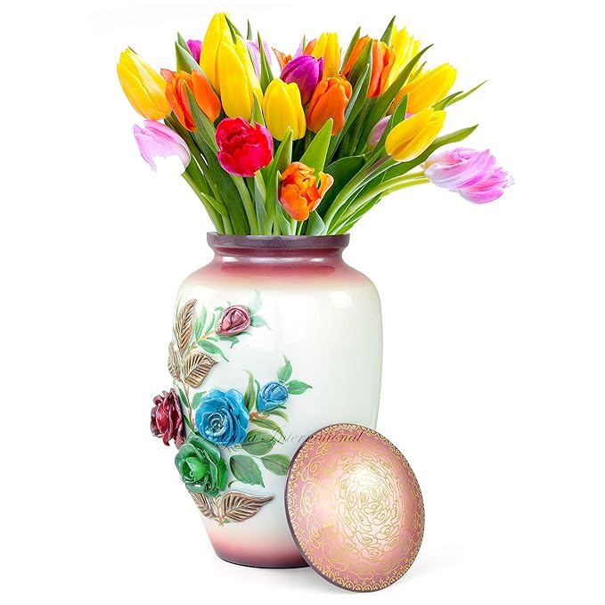 11" 3D Carved Decorative Flowers Aluminum Metal Cremation Urns for Human Ashes | Hand-Crafted Large Urn for Adult Cremation (Nibble Red)
