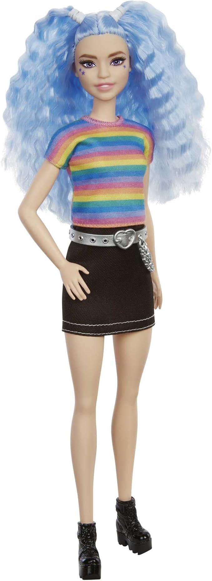 Barbie Fashionistas Doll with Long Blue Crimped Hair, Star Face Makeup, Multi-Color Striped Tee, Denim Skirt, Black Boots & Silvery Chain Belt, Toy for Kids 3 to 8 Years Old