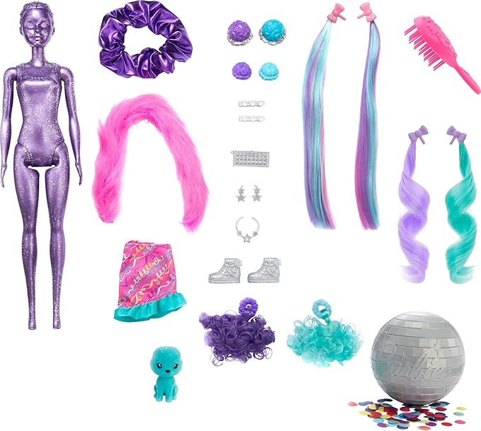 Barbie Color Reveal Doll, Glittery Purple with 25 Hairstyling & Party-Themed Surprises Including 10 Plug-in Hair Pieces