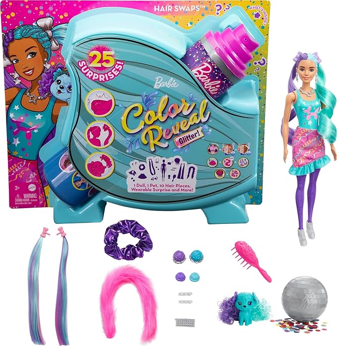 About This With 25 surprises in one package, Barbie Color Reveal Glitter! Hair Swaps dolls deliver the ultimate unboxing experience... Read more