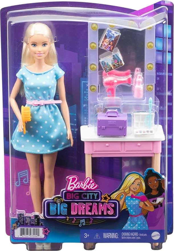 Barbie Big City, Big Dreams Malibu” Roberts Doll (11.5-in, Blonde) and Backstage Dressing Room Playset with Accessories, Gift for 3 to 7 Year Olds