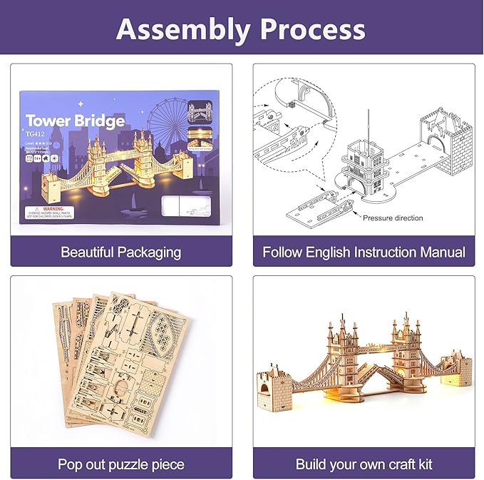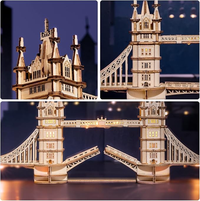 ROBOTIME 3D Puzzle Wooden Craft Kits with LED Light DIY Tower Bridge Construction Model Kit to Build for Teens Brain Teaser Puzzle Home Decor Birthday Gifts
