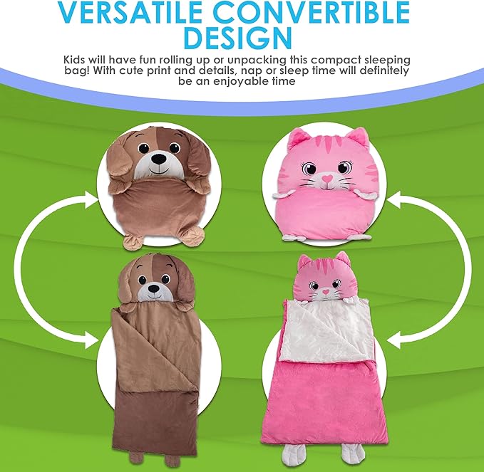 • VERSATILE CONVERTIBLE DESIGN: Kids will have fun rolling up or unpacking this compact lounger and pillow! With cute print and details, nap or sleep time will definitely be an enjoyable time as your little one curls up in this kitty cat sleeping bag with pillow. Our sleep loungers with built in thin blanket are a great alternative to bulky cots with its easy to store and machine washable design.
