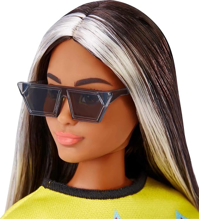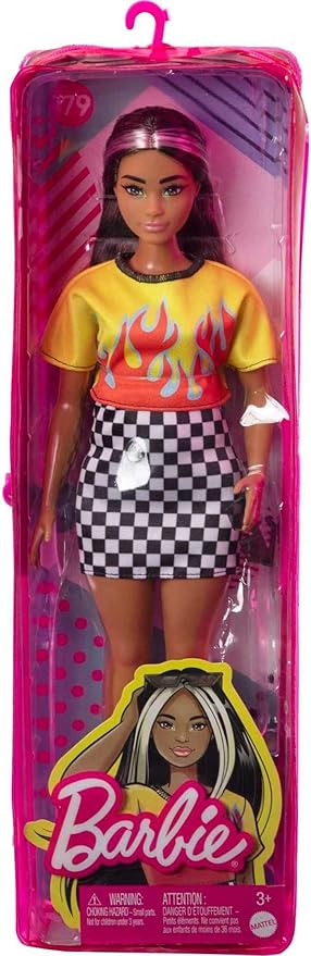 Barbie Fashionistas Doll #179, Curvy with Long Highlighted Hair, Flame Crop Top, Checkered Skirt & Accessories Including Sneakers & Sunglasses