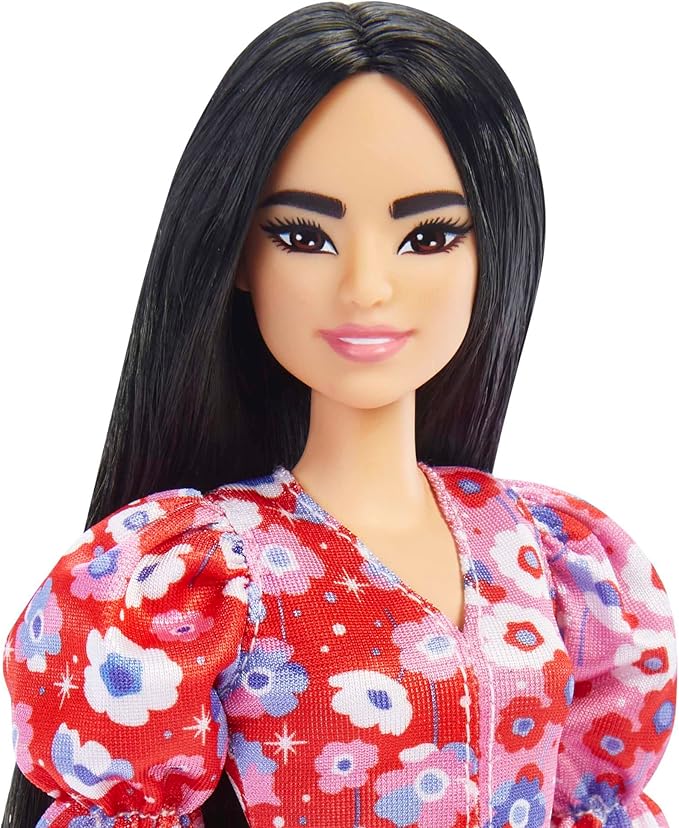 Barbie Fashionistas Doll #177 with Long Black Hair & Color Block Floral Dress & Accessories Including Strappy Purple Heels & Butterfly Ring