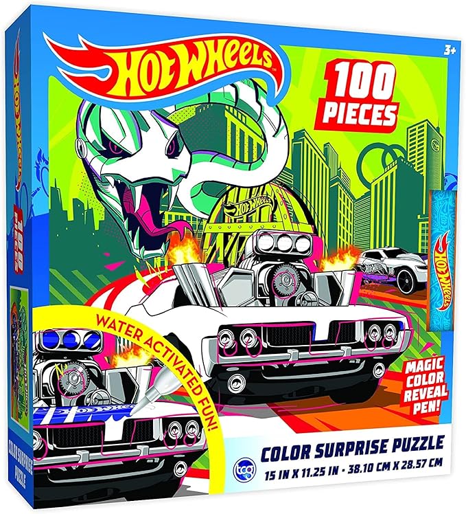 Hot Wheels - Color Surprise Puzzle - 100 Piece Magic Water Reveal Puzzle with Water Pen Included. Great Birthday Gift for Boys and Girls!