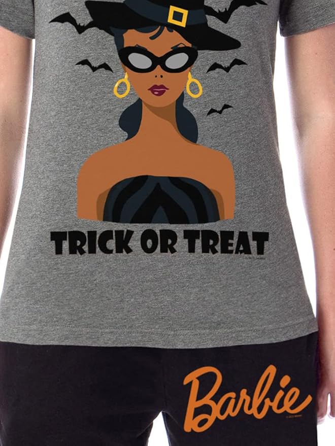• DETAILED THEME - This pajama set-top features a Barbie dressed up as a witch with the words "Trick or Treat" in a Halloween theme. The pants feature the Barbie logo along the left leg.