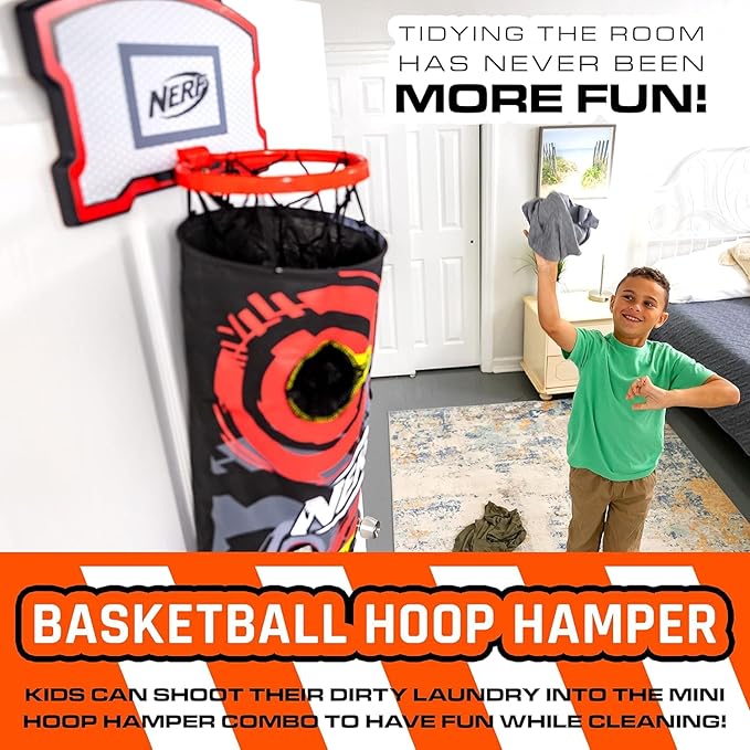 NERF Basketball Hoop Hamper - Laundry Layup Over the Door Basket + Shooting Target - Mini Hoop Hamper + Basketball Set