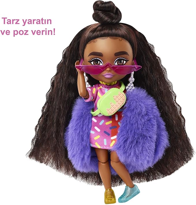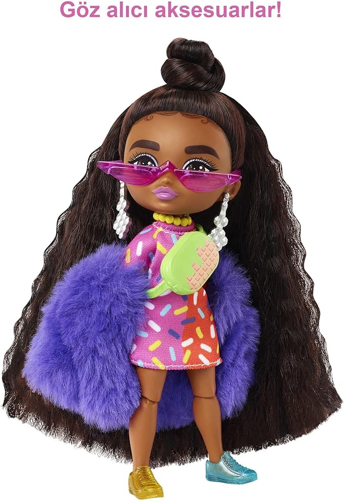 Barbie Extra Minis Doll #1 (5.5 in) Wearing Sprinkle-Printed Dress & Furry Coat with Doll Stand & Accessories Including Micro Sunglasses and Waist Bag, Gift for Kids 3 Years Old & Up