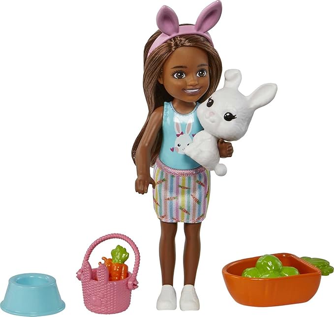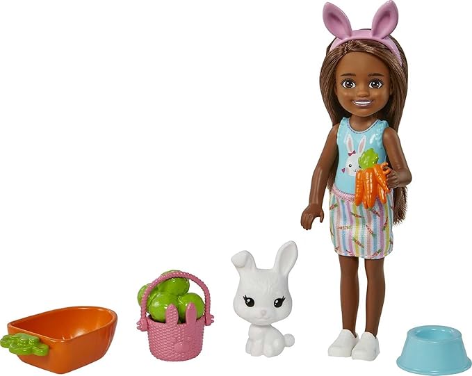 Barbie Chelsea Doll (Brunette) with Pet Bunny & Storytelling Accessories Including Pet Bed, Bunny Treats & More, Toy for 3 Year Olds & Up