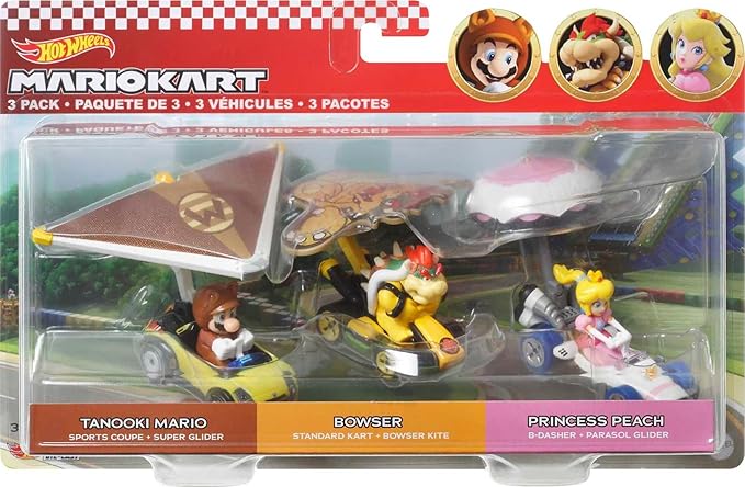 Hot Wheels Mario Kart Vehicle 3-Pack Set of Toy Cars with Gliders Inspired by Tanooki Mario, Princess Peach and Bowser
