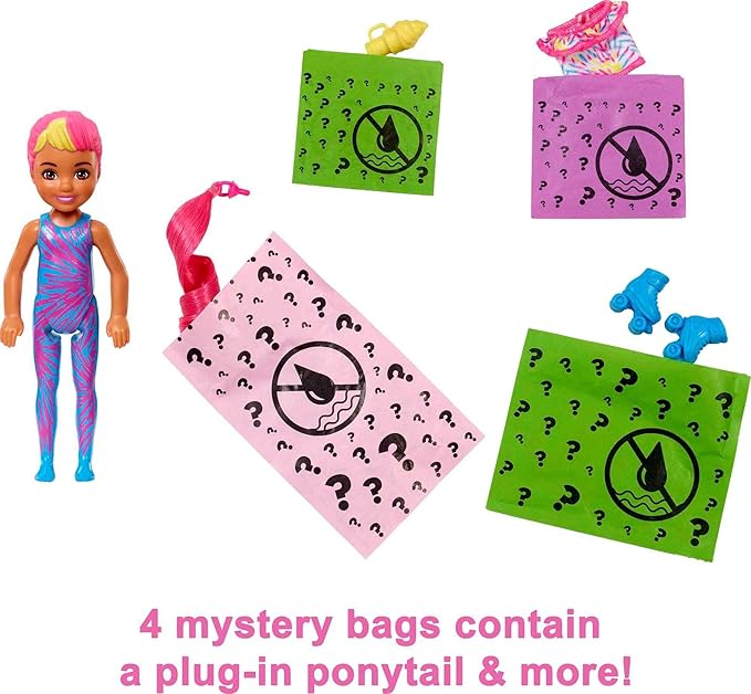 Barbie Color Reveal Small Doll & Accessories, Neon Tie-Dye Series, 6 Surprises, 1 Chelsea Doll (Styles May Vary)