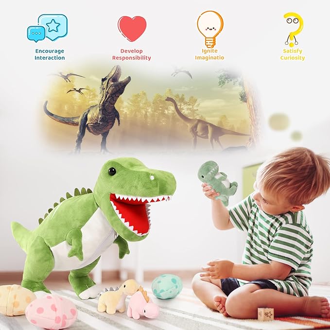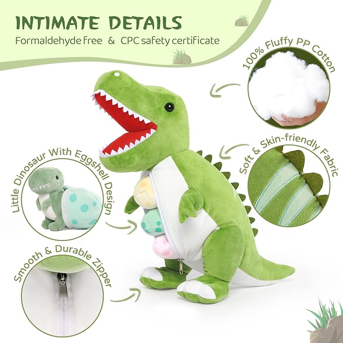 MorisMos Dinosaur Stuffed Animal with Babies,23.6'' Big T-Rex Mommy Stuffed Dinosaur with 3 Baby Dino Plush Toys, 3 Eggs,Boy Girl Dino Toys for Kid Birthday Christmas,Green T-rex