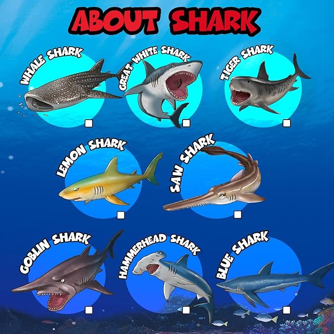 About This Shark Toys Set with a colorful booklet: Our 8 pack includes a variety of sharks: Whale shark, Great... Read more