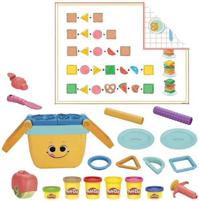 Play-Doh Picnic Shapes Starter Set, Preschool Arts and Crafts Kit with Picnic-Themed Tools & 6 Tubs, Sensory Toys for Kids Boys & Girls (3+), Non-Toxic Modelling Compound, Creative Craft Kit
