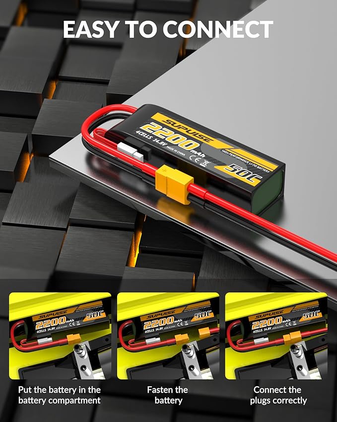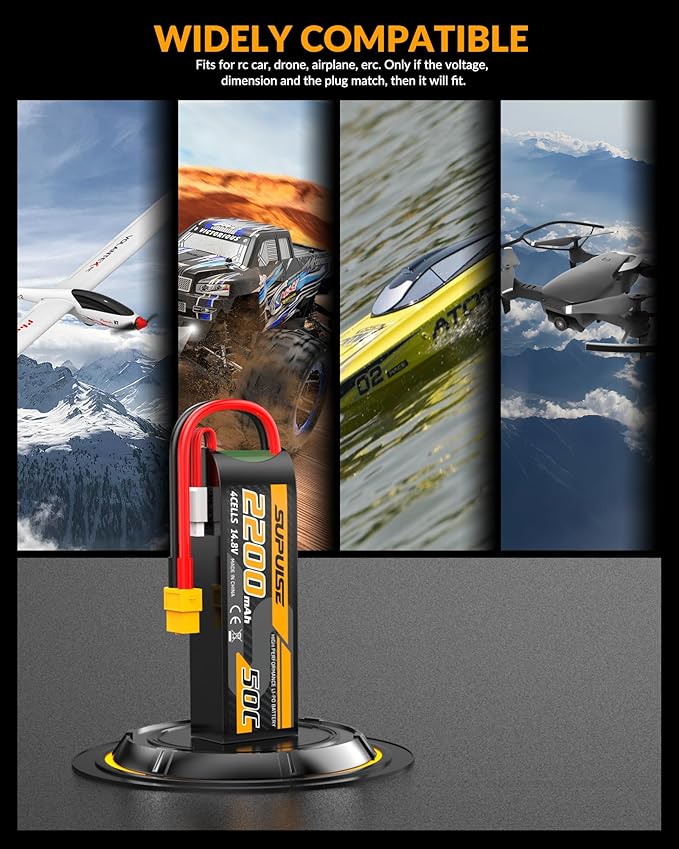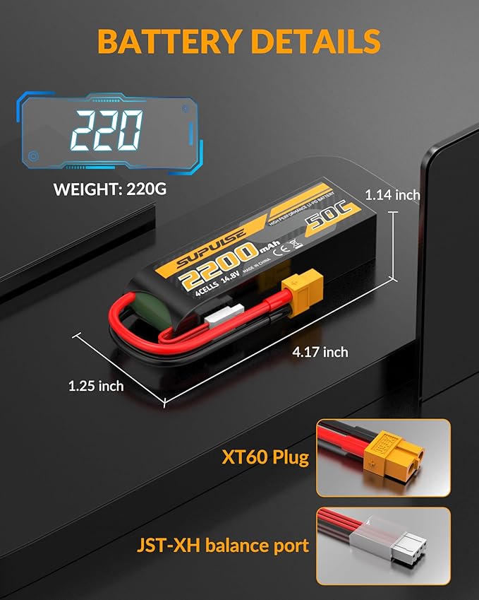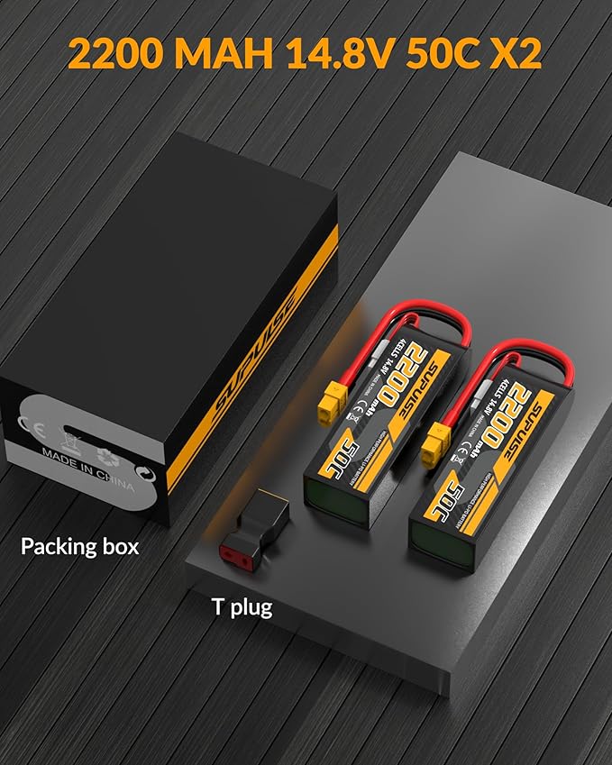 About This 【4S Lipo Battery specification】- Battery voltage: 14.8V; Configuration: 4S1P; Capacity: 2200mAh; Discharge: 50C; Connector: T plug and XT60... Read more