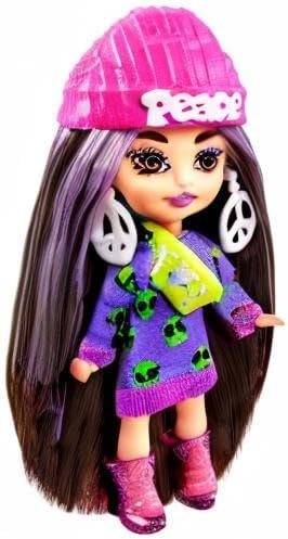 Barbie Extra Mini Minis Doll with Brunette Hair, Alien Sweater Dress & Peace Sign-Themed Accessories & Stand, 3.25-inch