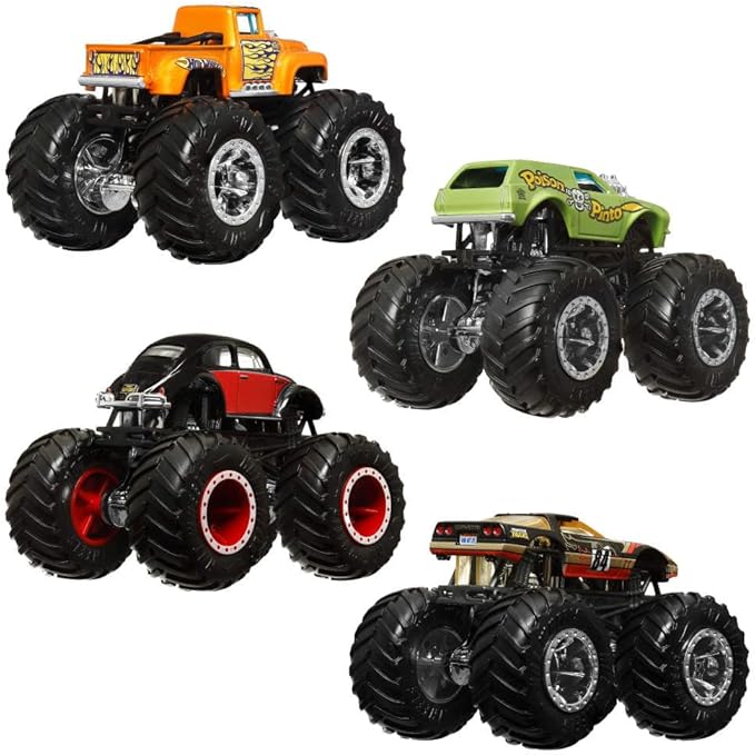 Hot Wheels Monster Trucks, 1:64 Scale Monster Trucks Toy Trucks, Set of 4, Giant Wheels, Favorite Characters and Cool Designs